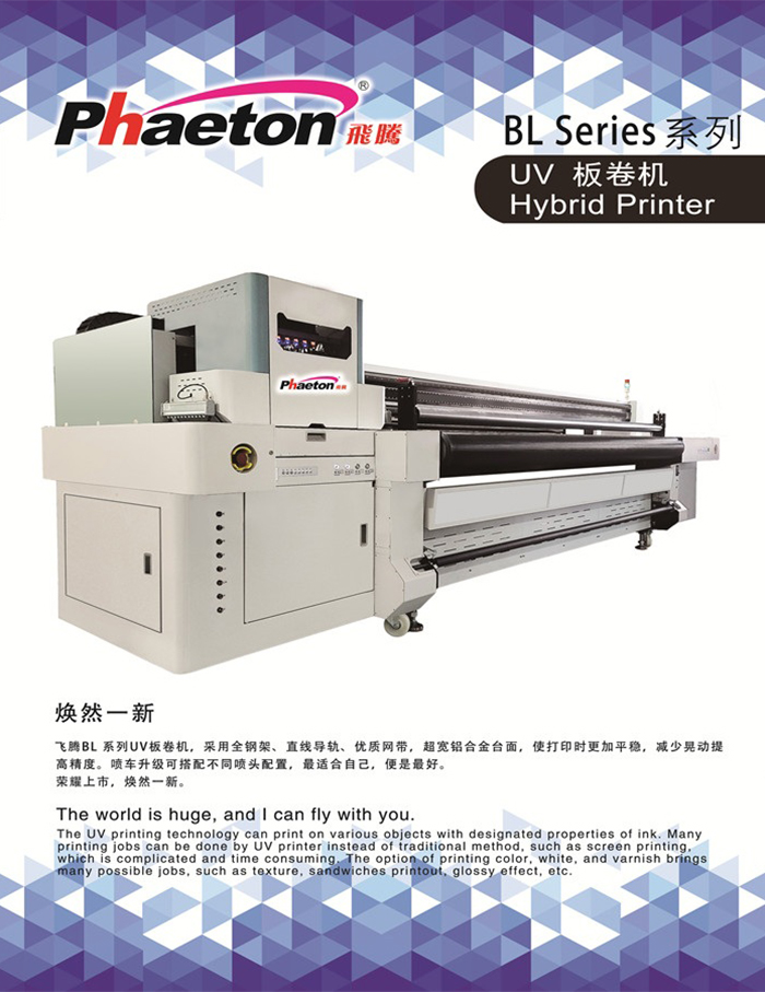 飛騰BL系列UV板卷機(jī),采用全鋼架、直線導(dǎo)軌、優(yōu)質(zhì)網(wǎng)帶,超寬鋁合金臺(tái)面,使打印時(shí)更加平穩(wěn),減少晃動(dòng)提 高精度。噴車(chē)升級(jí)可搭配不同噴頭配置,最適合自己,便是最好。 榮耀上市,煥然一新。